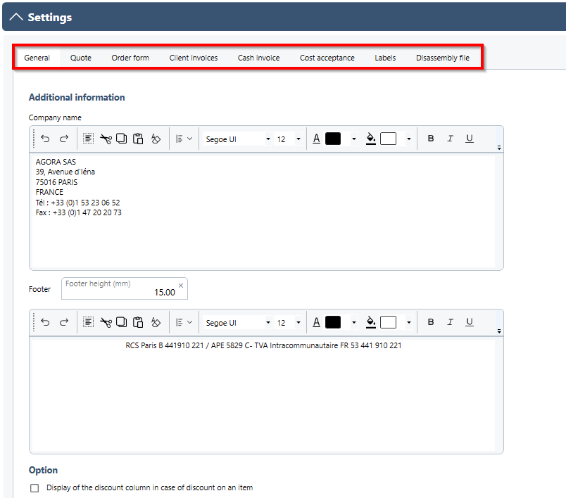 5/ Each tab corresponds to the configuration of a document type (quote, order forms, customer and cashier invoices, cost acceptance, labels, disassembly files/service files).