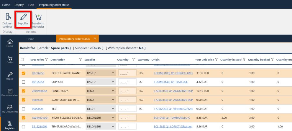 You can change the supplier associated with a selection of parts by clicking on « Supplier » and then selecting the desired supplier:
