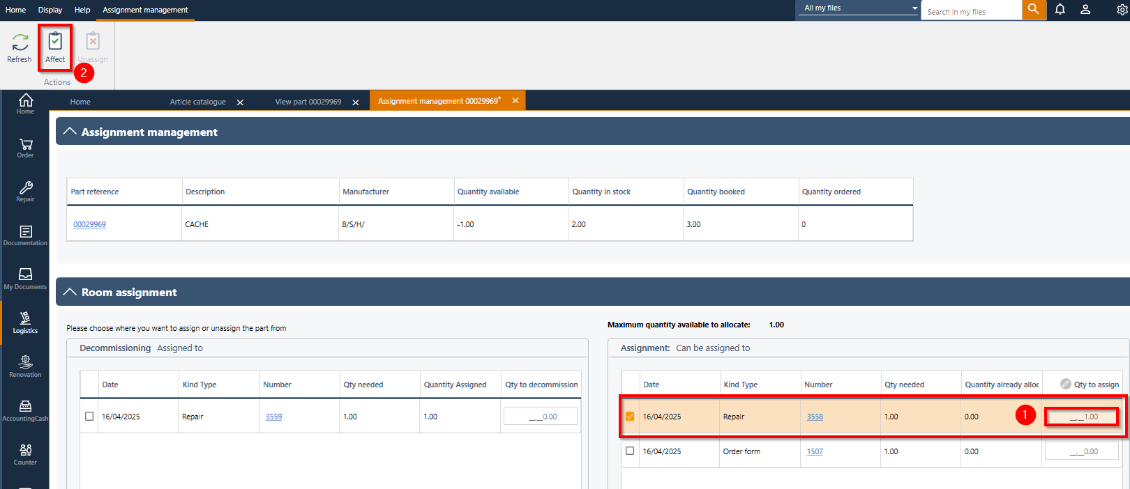 b. Assign the part by adding the quantity to be assigned, then confirming with the "Affect" button :