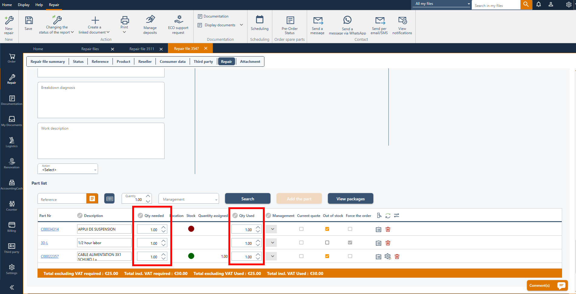 To align the quantities used with the quantities needed on all the lines of the job file, simply click on the two arrows icon.