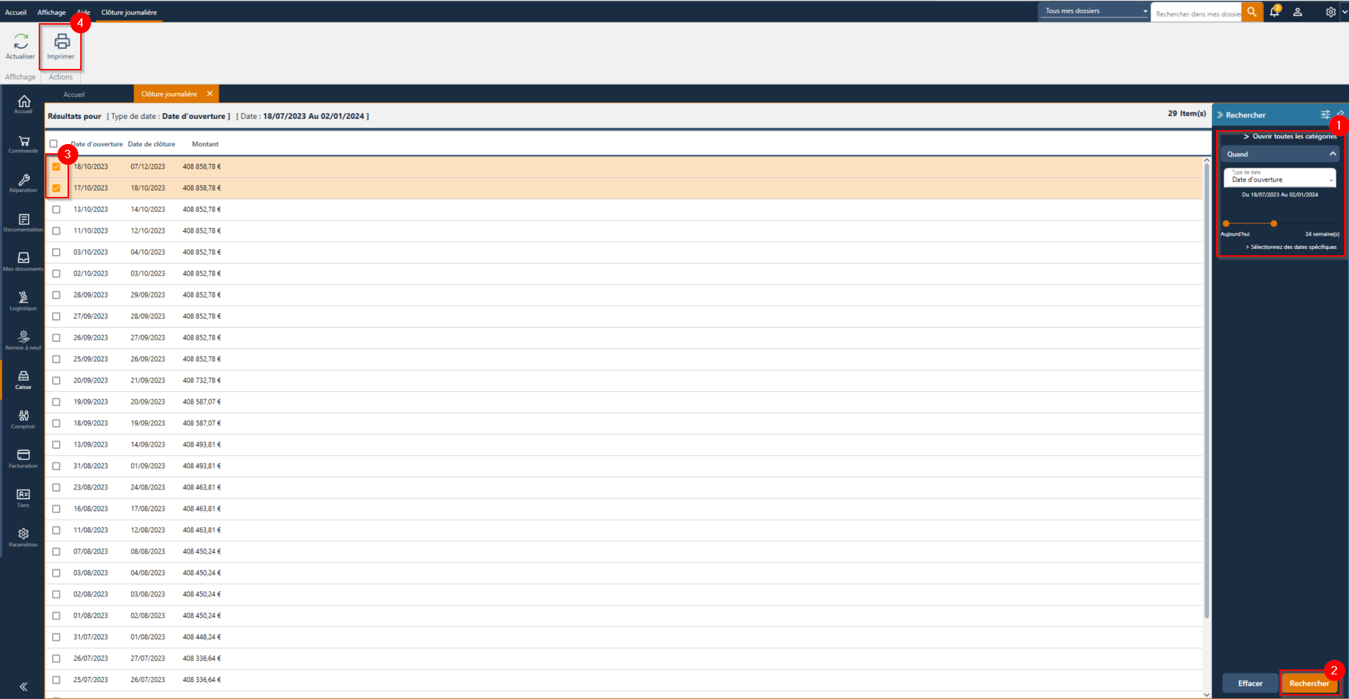 Possibilité de rechercher une caisse par date de clôture à l'aide de la barre de recherche et de l'imprimer