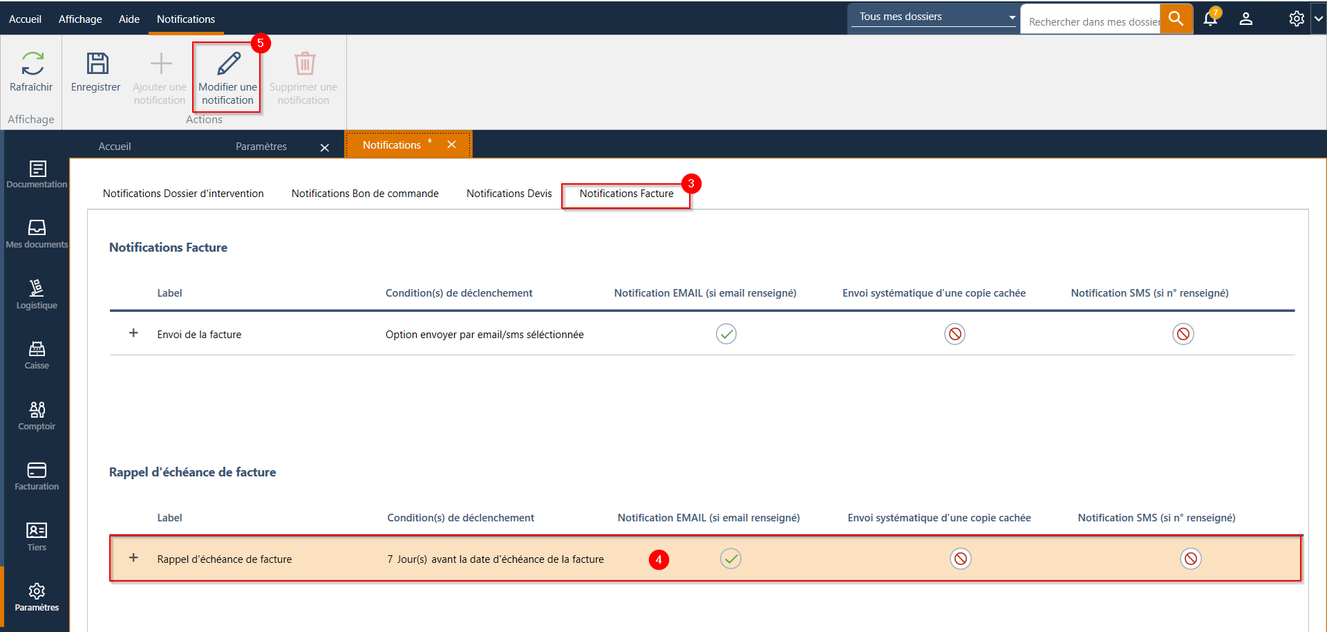 - Choisissez l'onglet "Notification facture", puis sélectionnez la notification "Rappel d'échéance de facture" et cliquez sur "Modifier une notification".