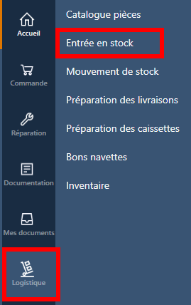 Afin de faire une entrée en stock par fournisseur, cliquer sur « Logistique » puis « Entrée en stock » :