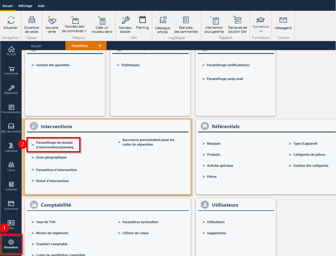 2/ Cliquer ensuite sur "Paramétrage du dossier d'intervention/planning" :