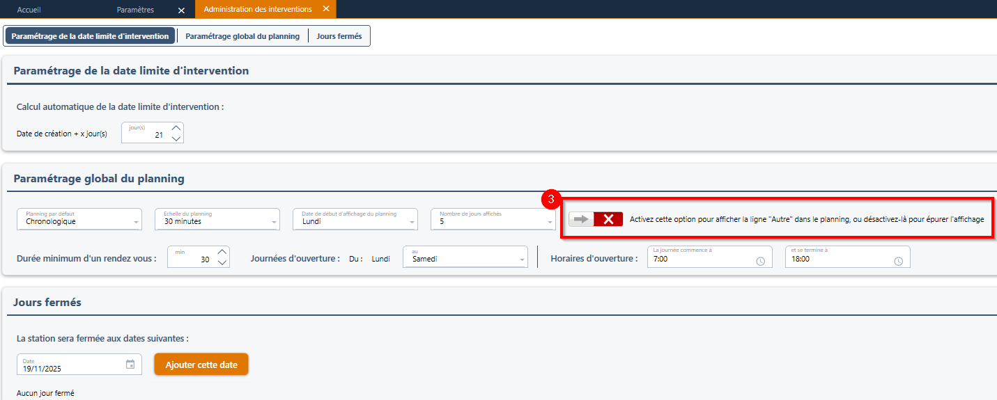3/ Faire glisser le curseur afin de désactiver l'option d'affichage de la ligne "Autre" dans le planning :
