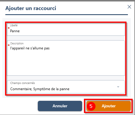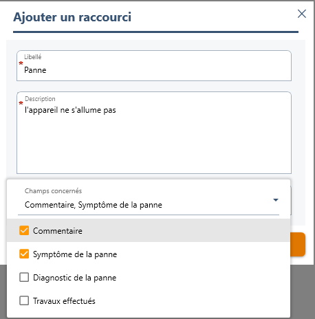cette pop de création permet de créer un libellé qui sera rattaché à une description et qui pourra être disponible selon le champ concerné (de la partie réparation) : Symptôme et/ou Commentaire et/ou Diagnostic et/ou Travaux effectués