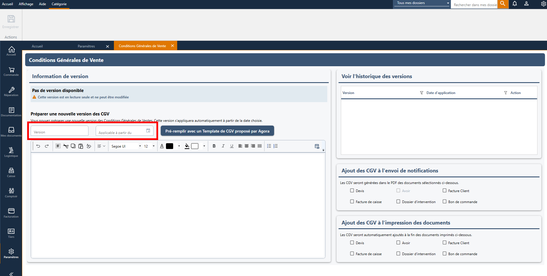 Il est possible de pré-remplir la version avec un template de CGV proposé par AGORA en cliquant sur le bouton "Pré-remplir avec un Template de CGV proposé par Agora" :