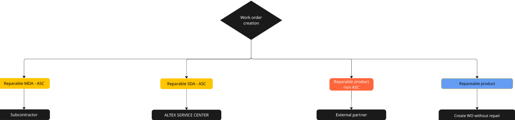 - Dacă produsul este un SDA, acesta va fi gestionat de Centrul de Service Altex: produsul este tratat ca un produs intern și urmează același proces ca un ordin de lucru intern (WO intern).